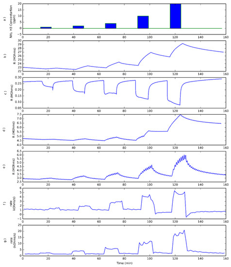 Increasing NH3 concentration pulses have been tested (a). Typical evolution of the resistance recorded in the dark for a sensor operated at room temperature exposed to ammonia pulses (b) equivalent to panel (b), but when the sensor is operated at 200 °C (c). Panels (d,e) show the responses to ammonia pulses described in the upper panel when the sensor is under pulsed UV light while being operated at room temperature or 100 °C, respectively. Lower panels (f,g) show the rates of resistance change when the pulsed UV light is OFF, as described in Equation (1), for a sensor operated at room temperature and at 100 °C, respectively.