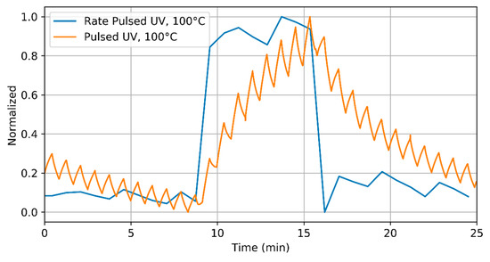 Detail of the sensor response to NH3, 5 ppm, when operated at 100 °C under pulsed UV light and the corresponding evaluated rate. Both appear normalized for clarity.