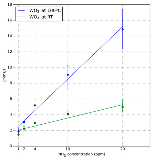 Figure 4 shows the calibration curves taking as response the rate of resistance change, evaluated when the sensor is operated under pulsed UV light at RT and at 100 °C. The error bars correspond to the maximum and minimum values obtained in the set of experiments. Even though the slope of the calibration curve (i.e., ammonia sensitivity) is higher when the sensor is operated at 100 °C, there is enough signal to reliably detect ammonia even when the sensor is operated at RT, with the consequent reduction in power consumption.