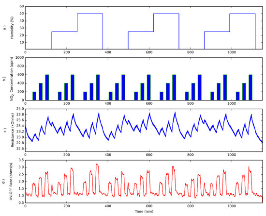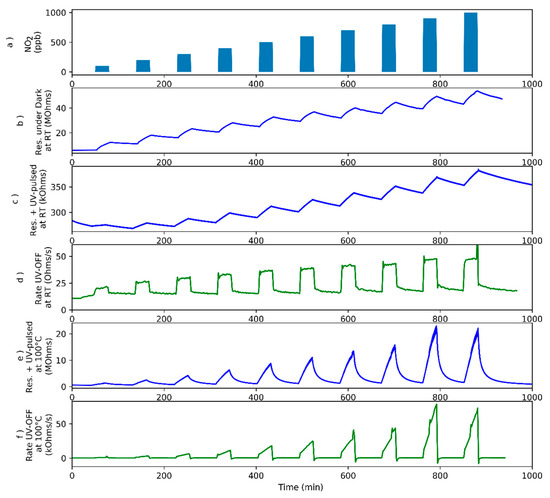 UV pulses result in the occurrence of a ripple in sensor resistance. This is reflected in Figure 1. This ripple is considered a transient signal in sensor response and the rate of resistance change both when the UV is ON or OFF have been found to give useful information for determining gas concentration [29]. Especially the fact that the rate of resistance changes when the light is OFF will be explored here, since it can be assumed to be closely dependent on the adsorption and reaction processes taking place on the gas-sensitive surface. Evaluating the rate in the period when the light is ON leads to similar information, but the signal is noisier.