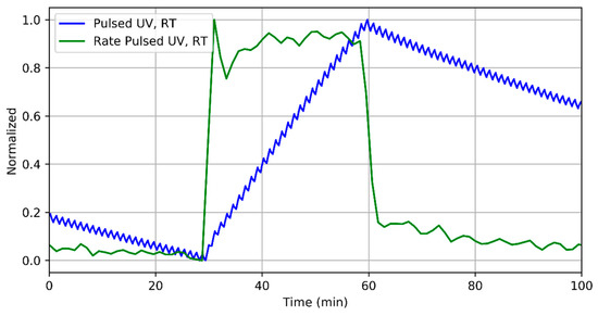 Figure 6 shows details of the normalized transient response (both electrical resistance and resistance change rate) to 400 ppb of NO2 when the sensor is operated at room temperature under pulsed UV light. As shown in this figure, the rate immediately reaches a stable value related to the gas concentration (this is similar to what was observed in Figure 3).