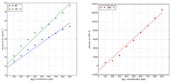 Figure 7 shows calibration curves for NO2 at different operating temperatures. Similar to the case of ammonia, heating the sensors has the effect of increasing the slope of their calibration curves (i.e., nitrogen dioxide sensitivity increases). However, the response and signal to noise ratio is good enough for reliably detecting nitrogen dioxide when sensors under pulsed UV light are operated at room temperature.