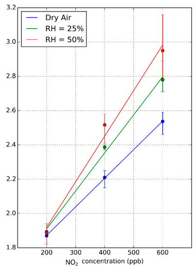 Additional measurements were performed at different humidity levels (dry air, 25% and 50% R.H.), considering three different NO2 concentrations (200, 400 and 600 ppb), as depicted in Figure 8a,b. In this case, an operating temperature of 50 °C was set, just to ensure that all measurements were performed at the same temperature and to avoid the occurrence of water condensation, since the water vapor generation system slightly increases the temperature of the gas flow input to the sensor chamber. As can be seen in Figure 8c, the sensor resistance reaches neither the steady state nor the baseline, as in the previous measurements in dry air. A small peak appears systematically when the system passes from dry air to 25% RH. This peak does not appear during the transition from 25% to 50% RH levels, which led us to associate this peak to a response when the sensor changes from dry to humid operation. Checking Figure 6d, where the resistance change rate is depicted, the three gas concentrations can be easily identified in spite of the different ambient humidity levels. An additional peak appears when passing from dry air to 25% RH, which is related to the previously described peak that appears in sensor resistance. Checking the calibration curves obtained for the three relative humidity levels (see Figure 9), it is possible to notice that, in fact, humidity has the effect of slightly increasing the sensitivity towards nitrogen dioxide. Therefore, the system is not immune to humidity, but the effect is quite low (sensitivity increases by about 10% when RH changes from 25% to 50%).