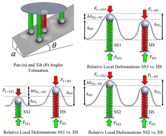In Equation (1), represents the position of the ith sphere, and with represents the distance between the ith and jth sphere in the reference system of the sensor. and are the known spring constants of the soft and hard springs, respectively. The seven unknown parameters are: the pan angle , the tilt angle , the displacement of the soft tissue in the points of contact, with and the stiffness of the soft surface , and are collected in the vector of the problem’s unknowns, . Solving the system of nonlinear equations , in Equation (1), involves finding a solution such that every equation in the nonlinear system is equal to zero, i.e., find a vector such that . The major algorithms used for solving nonlinear equations proceed by minimizing a sum of squares of the nonlinear equations, which is equivalent to an unconstrained nonlinear least squares problem.