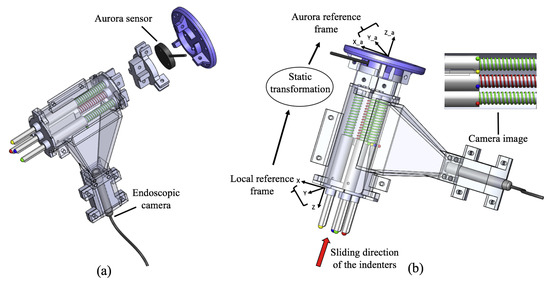 Stiffness probe integrated with a commercially available tracking system: (a) Exploded view of the sensor showing the position of the Aurora tracker. (b) Schematic representation of the sensor’s working principle: the interaction with external objects generates the sliding of the indenters, hence, the visual features change their positions in the camera’s image. The correlation between the indenters and the features allows to measure the new positions of the indenters in the local reference frame. A static transformation maps the new positions of the indenters from the local frame into the tracker frame.