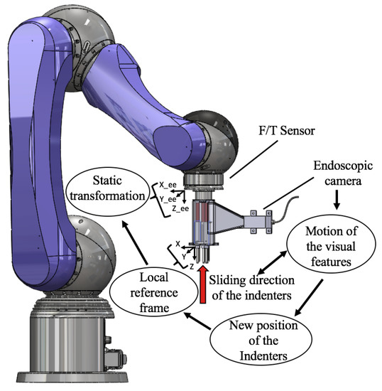 Stiffness probe fixed at the tip of the robotic arm: the interaction with external objects generates the sliding of the indenters. Hence, the visual features change their positions in the camera’s image. The correlation between the indenters and the features allows for measuring the new positions of the indenters in the local reference frame. A static transformation maps the new positions of the indenters from the local frame into the robot kinematic chain.