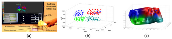 Stiffness mapping of homogeneous silicone phantoms: (a) the experimental setup; The discrimination between the different stiffness values of the silicone samples is visible in the coloured points in (b); The post-processed stiffness map is illustrated in (c).