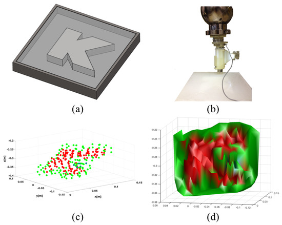 Computation of the stiffness map: CAD model of the phantom mould (a); Experimental setup (b); Post-processed map and generated surface are shown in (c,d). The stiffness of the track (red) is successfully distinguished from the surrounding silicone (green).