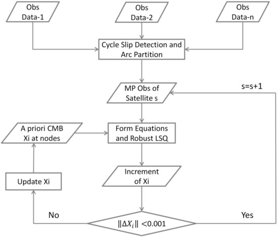 A flowchart of our CMB estimation procedure is shown in Figure 1 while the description of the model and parameter processing is given in Table 1. First, Turbo-edit algorithm using the MW linear combination, together with the carrier phase geometry-free combination, is applied to detect cycle-slips [16]. Second, the multipath combinations of each continuous arc are derived. The coefficients of the piecewise linear model are calculated according to the elevation angle. Because the value of is unknown to us. Instead, we calculate A by averaging the multipath arc with the CMB corrected. Hence the iterative least squares algorithm is used to estimate the CMB increment corresponding to the CMB initial value and then get the precise result of A. During the iteration, only when the module of the CMB increment is less than 0.1 cm, the procedure ends and the final CMB values are derived. In order to eliminate the rank deficiency, we add a constraint that the sum of the corrections equals zero for each satellite at each frequency. In order to mitigate the impact of possible biases, caused by for example, large multipath effects, un-detected cycle slip, on the parameter estimation, the multipath observation with a large residual will be down-weighted during the iteration.