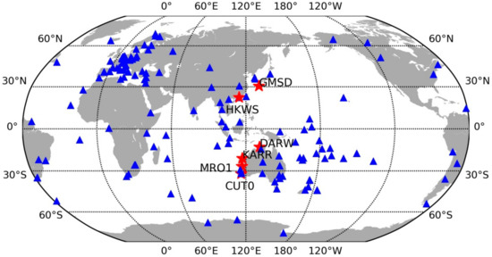 Distribution of the BDS reference network and user test stations. The blue triangles denote the reference stations used for FCB estimations; the red stars denote the user stations used for investigating the performance of the proposed CMB model.