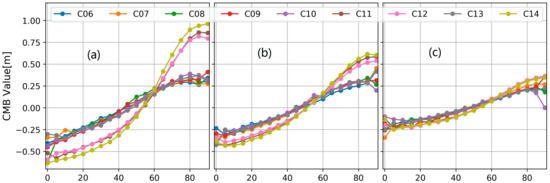 Firstly, our CMB corrections at every 5° elevation node for B1, B2 and B3 are shown in Figure 3. As we can see, the code measurements of MEO satellites tracked on B1 frequency at high elevations are seriously affected by the code bias, which reaches close to 1.0 m especially when the elevation rises up to 80°. The IGSO satellites are less impacted by the CMBs than the MEO satellites especially at B3 and B2 frequency. Besides, for each BDS IGSO + MEO satellite, the code biases on B2 are much smaller than those on B1 and those on B3 frequency are smallest. More importantly, it is found that the B1 CMB of C14 is obviously different from that of other MEO satellite C11 and C12. For the elevation range 0–30°, the B1 CMB of C14 is smaller than other MEO satellites while for the range 70–90° its value is larger than those with a difference close to 0.1 m. These results demonstrated the existence of the CMB difference even for the satellites at the same orbit type. It indicated that it is more reasonable to estimate the CMB corrections for each BDS IGSO + MEO satellite.