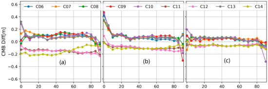 As shown in Figure 4, a significant model inconsistency was observed for the elevation below 5° and over 85°. This is because for CMB estimation, the multipath combination with low elevation is heavily down-weighed and the number of multipath combination with high elevation is relatively less. For the elevation between 10 to 80°, the B3 CMBs from two models have a good consistency with each other. However, for the B1 frequency, the CMB difference of C14 increased from about −0.2 m to about −0.05 m while for C11 and C12, the B1 CMB difference decreased from about −0.1 m to −0.2 m. Also the B1 CMB difference variations of the IGSO satellites are slightly different from each other.