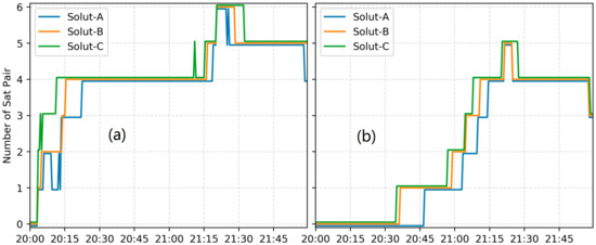 Time series of the number of BDS WL and NL resolved ambiguities for solution A, B and C, respectively. (a) the number of BDS WL resolved ambiguities; (b) the number of BDS NL resolved ambiguities.