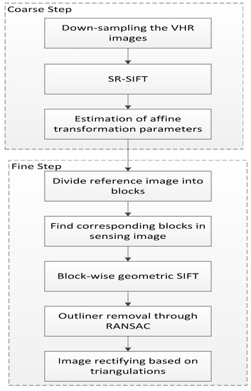 The proposed large size HR image registration method is a coarse-to-fine matching method. In the coarse matching stage, the image is downsampled to lower resolution, and the images are matched by a robustness matching method (SR-SIFT). The coarse geometric relation between images is estimated according to the matching points. In the fine matching stage, the reference image is divided into blocks, and the corresponding blocks in the sensing image are detected by coarse geometric relation. In each block, the proposed geometric SIFT is used for matching. After all blocks are matched, the sensing image is resampled to the reference image coordinate by TIN transformation. The flow chart of the proposed method is shown in Figure 1.