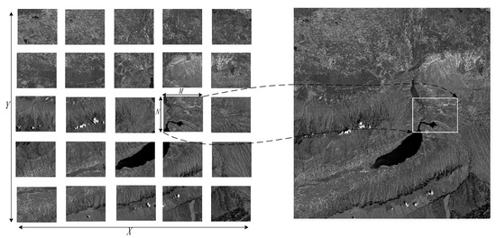 The entire reference image is divided into smaller image blocks as shown in Figure 3. In this paper, the block size is set to 1024 × 1024. The affine transformation parameters are used as geometric constraint to find the corresponding matching block in the sensing images. For each block image, the four corners , , , are projected onto the sensing image by affine transformation parameter with Equation (3), as shown in Figure 3. After the projection, the minimum enclosing rectangle (MER) of the four projected corners is determined. Since the affine transformation parameters are acquired at low resolution, they do not produce accurate relationship between images. The size of the MER in the sensing image should be expanded. The expanded size should not be excessive to avoid redundant feature descriptors. The expanded size is thus set to 20 pixels. The image matching is performed in each block. With block division, the memory problem can be addressed.