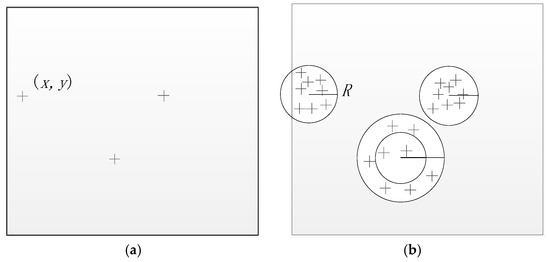 The current feature matching method searched all of the key points on the image. Here, considering the coarse registration relationship between images is obtained at coarse matching step, the paper proposes a search matching method which just searches the key points in the predict area. As shown in Figure 4, the reference image matches with the sensing image in the predict area. The key point position is located in in the reference image, and the predicting matching area is located at the point of the pixel coordinate within the radius R of the circle. is calculated by according to the coarse registration relationship using Equation (3). Matching the keypoint , the search can be confined to the predicting area in the sensing image as shown in Figure 4b rather than on the global image. Because the matching search area decreases, the matching computational complexity is decreasing and running time is speeding up. The following situation may affect the search matching method. If the key point is located on the image boundary, the possible matching circle area exceeds the image boundary; however, if the number of the key points in this possible circle area is sufficient (more than 20 here), then the proposed search matching method can proceed. The adequate key points here guarantee that the KNN algorithm searches the nearest and the second nearest key point in the possible circle area. When due to a low contrary texture in one possible circle area the number of key point is inadequate, then the radius R can be expanded, ensuring sufficient key points to search. Considering the coarse relationship between images is not accuracy, and the R is set to 50 pixels. The process of the possible circle area matching method is as follow: