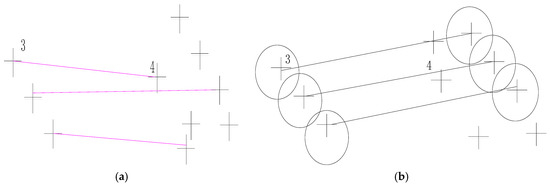 Figure 5 is the error matching result between local images by SIFT. In Figure 5a, point pair ID 3 and 4 are a mismatch pairs. By the geometric matching method, the point 4 in Figure 5b is not in the predicting area projected with a circle of radius R by the point 3 in Figure 5a. The mismatch pair 3 and 4 would be eliminated previously. In addition, with the key point searching area narrowed, without interference by similar key point descriptors, the Euclidean distance ratio between the nearest neighbor and the second neighbor may be more significant, and the key point is more effective for finding the corresponding point. In other words, matching is by propagation, and by the geometrical constraint the error propagation domain is reduced from the whole image to the specified local block.