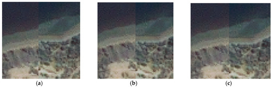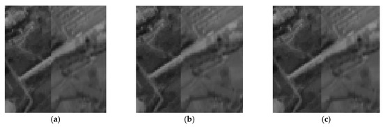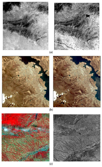 Three datasets are used for experiments which are downloaded from the homepage of ISPRS (http://www.isprs.org/data). (a) The dataset 1 consists of a pair of ZY3 multispectral images (5.8 m/pixel, 8817 pixel × 9215 pixel). The reference image is the green band (0.52–0.60 μm), the sensing image is near-infrared band (0.76–0.90 μm); (b) Dataset 2 consists of a pair of IKONOS panchromatic images (1 m/pixel, 12,122 pixel × 13,148 pixel); (c) Dataset 3 acquired by ZY3 consists of a multispectral (MS) image (5.8 m/pixel, 8817 pixels × 9283 pixels) and a panchromatic (PAN) image (2.1 m/pixel, 24,525 pixels × 24,410 pixels).