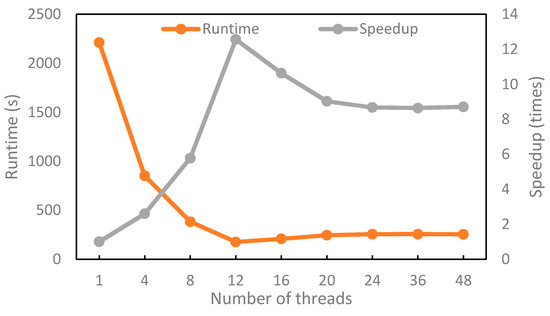 In this section, to demonstrate the advantages of the multi-thread matching method using OpenMP, the runtime and increase in speed were measured for the different number of cores that were used for processing. We perform the experiment using Dataset 3. Figure 9 shows the runtime and increase in speed as a function of the number of threads, p.