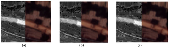 In this section, we compare the proposed HR registration method with the method proposed by Lee and the method proposed by Li. Lee uses an adaptive block processing matching strategy to matching the HR satellite images [19]. Li matches the points in the down-sampling images and the match points from low resolution image are used as interest CPs for high resolution image matching [26]. Figure 10, Figure 11 and Figure 12 are the matching result of the three HR registration method. The first column is the matching result by Lee’s method, the second column is the matching result by Li’s method and the third column is the matching result by the proposed method. The matching results are shown with TINs. To better show the results, the matching point is 20 percent of all matching points. The matching points of the proposed HR registration method are denser than the results of the methods proposed by Lee and the method proposed by Li. Figure 13, Figure 14 and Figure 15 compares the accuracy for the three HR registration method. Figure 13a, Figure 14a and Figure 15a are the local registration results by Lee’s method. Figure 13b, Figure 14b and Figure 15b are the local registration results by Li’s method. Figure 13c, Figure 14c and Figure 15c are the local registration results by proposed method. The registration results of Lee’s and Li’s methods are inaccurately aligned in contrast to the correct registration results of the proposed method. The registration accuracy of the proposed method is thus higher than that of Lee’s and Li’s methods.