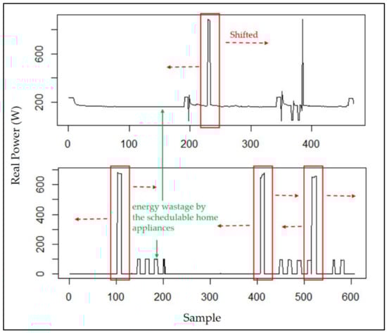 A smart city in brief can be defined as a city in which Information and Communication Technologies (ICT) such as smart sensing, cognitive learning as well as context-aware computing are employed to make lives more comfortable and sustainable []. The Internet of Things (IoT), being designed and used to respond to needs for real-time and context-specific information intelligence and analytics to address specific local imperatives [], is a key enabler for smart cities. Management of smart and green buildings and houses in downstream sectors of a smart grid often requires analyzing IoT data from inter-connected end-sensing devices and actuators, to optimize electrical efficiency and comfort satisfaction. Smart grid techniques, which conduct ICT to upgrade a traditional power grid into a smart one, are being developed to gains of energy inefficiencies by consumers where residential households have a significant role in energy consumption and threaten the power grid in grid health and power reliability. From smart and green buildings and houses in downstream sectors of a smart grid, significant efficiency gains make cities sustainable in terms of resources. The realization of smart, energy-efficient as well as green home infrastructure will form the backbone of future green city architecture []. Therefore, energy management covering Demand-Side Management (DSM), peak load reduction, and carbon emissions reduction [] in smart buildings and houses is a key aspect of building efficient smart cities []. As pointed out in [], there has been evidence from various load surveys that the demand of electricity in residential and commercial buildings is highly variable and changes throughout the day. Hence, conducting efficient energy management of home demands as well as reducing peak energy demands meet the rapidly growing need of building efficient smart cities. In contrast with increasing the maximum power generation capacity by more required power generators of power plants in a smart grid, reducing peak loads is mostly valuable for utilities to meet the increased energy demands. Demand Response (DR) strategies that motivate consumers to re-shape load profiles as well as limit peak energy demands by home appliances through smart meters based on time-based rates are gaining an importance in a smart grid, due to continuously increasing energy demands by consumers. Both the consumers that respond to DR signals in exchange for a discount on electricity prices and the utilities that ensures the un-jeopardized stability of the smart grid can benefit from DR as DSM.