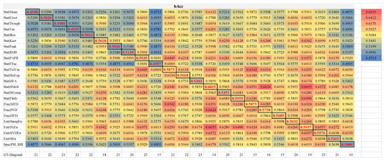 Performance measurement bAcc of the pairwise feature types. The heatmap was colored from blue (minimal bAcc = 0.4713) to red (maximal bAcc = 0.6655). The diagonal grids with red font and black box are pairs of the same feature types, e.g., the top left box gives the bAcc = 0.4948 of a pair of feature types (Stat|Mean, Stat|Mean). The columns and rows are in the same orders of all the 24 feature types. The row “GT-Diagnal” gives the numbers of pairwise orchestrations of feature types that achieved better bAcc than the diagonal grids.