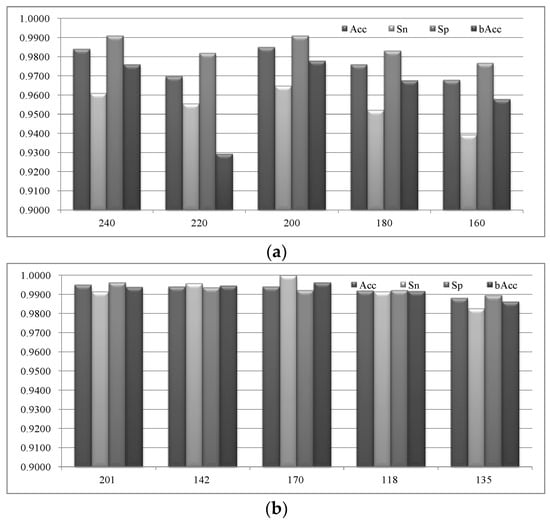 The best value for the parameter pNumF is 200. Firstly, the feature selection module iRFE selected the best feature subset when the parameter pNumF is 200, as shown in Figure 5a. Both of the two measurements Acc and bAcc reached their best values at pNumF = 200. But the sensitivity (Sn) was still not very accurate and didn’t reach 97.00% for all the choices of pNumF, i.e., 160, 180, 200, 220, and 240. Then we applied the redundancy removal step BackFS on the feauture subset, and significantly improved the seizure detection model, as shown in Figure 5b. The value 200 is still the best choice for the parameter pNumF. We may see that the three measurements Sn/Sp/bAcc reached the best values for pNumF = 200, but Acc was slightly smaller (0.10%) than that of pNumF = 240. Considering that the model of pNumF = 200 achieved Sn = 100.00% and Sp = 99.22%, while the model of pNumF = 240 achieved Sn = 99.13% and Sp = 99.61%, it may be preferred to have a minor increased false alarm rate with an accurate seizure capture capability.