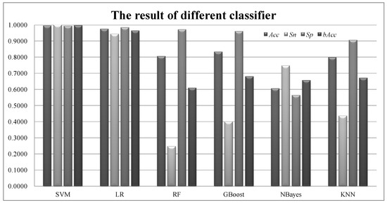 We further evaluated whether other classifiers may achieve better classification performances on the best feature subset, as shown in Figure 6. The classifier SVM was used in this study and demonstrated a significant improvement over the four classifiers, i.e., RF, GBoost, NBayes and KNN. The best of these four classifiers didn’t achieve bAcc = 67.98% better than 70%. The classifier LR performed very well in bAcc = 96.33%, but the best classifier SVM outperformed LR by an improvement of 3.28% in bAcc. SVM achieved Sn = 100% in detecting the positive samples while Sp = 99.22% for detecting the negative controls.