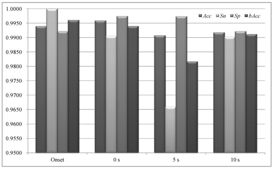 The same modeling procedure was applied to the problem of predicting epileptic seizures before their onsets, as shown in Figure 7. The two datasets “Onset” and “0 s” are different in that the positive samples of the dataset “Onset” were extracted from the seizure occurring time, while the positive samples of “0 s” were extracted right before the seizure onset. The positive samples of the datasets “5 s” and “10 s” were extracted 5 and 10 s before the annotated onset time of the epileptic seizures. Our data showed that there was a slight decrease in bAcc for predicting epileptic seizures in advances, but the overall performances were acceptable, with bAcc > 98% for all the three cases of seizure predictions. Due to the fact that the dataset didn’t provide EEG signals more than 10 s for most patients, this study didn’t evaluate our experimental procedure on predicting epileptic seizures with longer time before onset. A recent study presented a proof-of-concept experiment of predicting epileptic seizures 15 min before happening using the invasive intracranial EEG signals and achieved 69% in sensitivity, which left large room for improvements [71].