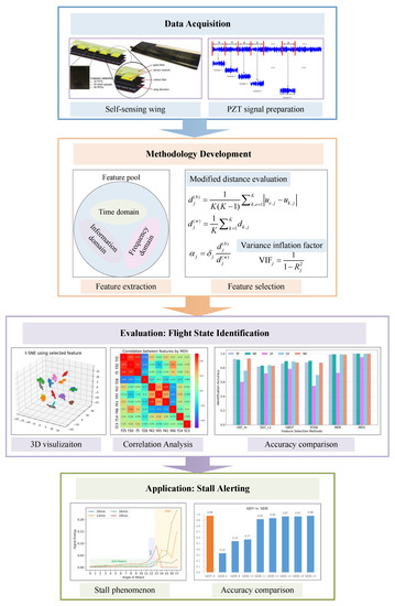 We have demonstrated the effectiveness of establishing the mapping relationship from the feature space to the flight state space through neural networks modelling [27]. This paper significantly improves the previous work by creating a much larger feature pool and considering the co-linearity among various features. To sum up, the objective of this paper is the introduction and evaluation of a novel feature selection method for accurate flight state identification of a self-sensing wing structure based on experimental vibration data recorded by piezoelectric sensors under multiple flight states. The developed method belongs to the filter family and is capable of obtaining a group of most important features for classification with low mutual dependency. The framework of the data acquisition, methodology development, evaluation and application is shown in Figure 2.