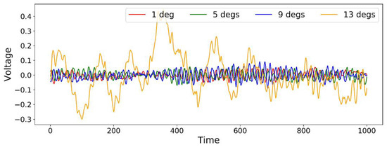 The first data set includes PZT signals with a coarse resolution covering the range of 16 flight states corresponding to combinations of four AoAs (1, 5, 9, 13 degrees) and four airspeeds (10, 13, 16, 19 m/s). Four signal segments are shown in Figure 3 under a series of AoAs and a fixed airspeed of 10 m/s as an example.