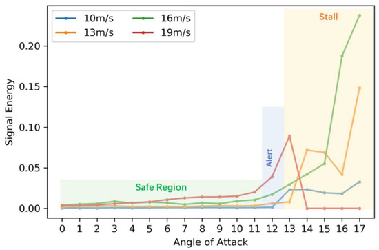 The signal energy variation with respect to the angle of attack is similar under four different airspeeds. It is noticed that for relatively low velocities (10 m/s, 13 m/s & 16 m/s), the significant increase occurs approximately after 14 degrees while for the relatively high speed (19 m/s), stall happens much early at 13 degrees. It should be noted that the data were stopped recording after 13 degrees with the high speed of 19 m/s, which is reflected in the red line with zero energy starting from 14 degrees. Therefore, we define the orange shaded area starting from 13 degrees as the stall region which should be avoided. Moreover, it is observed that at 12 degrees, the signal energy for some flight states has certain increase compared with the rest small angles. This degree is defined as the alert region as the transition between the safe region marked in light green and the critical stall region. When the self-sensing wing comes to this region, warnings should be provided to the flight control for angle reduction.