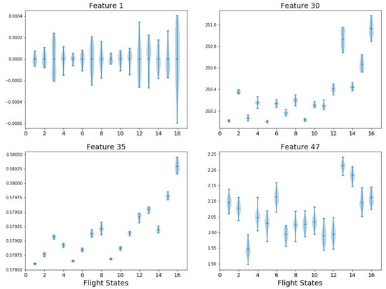 It is observed from the table that the ranking results vary with the different methods. An intuitive evaluation is to simply visualize the features distribution under various flight states. For example, four features are plotted in Figure 5 including: F1 (mean value in time domain), F29 (spectrum kurtosis in frequency domain), F35 (spectrum power convergence in frequency domain), and F47 (Hurst Exponent in information domain). The x axis denotes the 16 flight states while the y axis is the feature value before normalization. The shaded area along each vertical line segment represents the feature distribution in a single flight state and each subplot of Figure 5 describes a feature distribution on 16 flight states. As mentioned in Section 3, F1 (mean value) has no effects in classification. Correspondingly, F1 has the highest overlap among flight states. Similarly, F47 has large overlaps which exhibits pool classification capability. Theoretically, the ranking of F1 and F47 should be low but they are ranked high in GBDT and STAB. In comparison, F30 and F35 show smaller overlap and thus have better classification performance. This may provide some physical insights of the effectiveness of different feature selection methods.