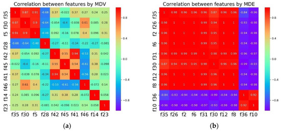 Correlation between features by MDV (a) and MDE (b).
