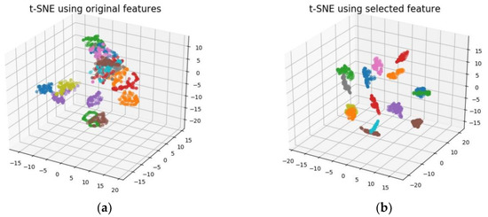 3D visualization by t-SNE: (a) t-SNE using original features; (b) t-SNE using selected features.