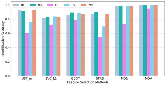 It can be observed that our proposed method MDV achieves the highest identification accuracy in all five machine learning models and particularly, there is a significant improvement in Logistic Regression. This demonstrates the superior effectiveness of MDV. The comparison between MDV and MDE shows that a group of individually powerful features with low collinearity can lead to better results.