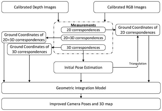 The geometric integration model integrates hybrid correspondences according to a rigid mathematical method. Key points are extracted from the RGB-D frames and categorized as 2D and 3D feature points according to the depth validity of the features. Based on the feature matching method, the correspondences are then organized into three categories: 2D correspondences, 2D-3D correspondences and 3D correspondences. First, a camera tracking strategy involving 3D correspondences is used to obtain the initial camera pose while also considering the depth uncertainty. The ground coordinates of each 3D correspondence are averaged with the ground value of two corresponding 3D features. For the 2D-3D correspondences, the depth is associated with the correspondence from the key point with a valid depth value. For the 2D correspondences, the 3D coordinates are obtained by stereo triangulation based on the initial camera poses. Finally, the initial camera poses are used as inputs in the geometric integration model together with 3D correspondences, 2D-3D correspondence and 2D correspondences identified from frame pairs.