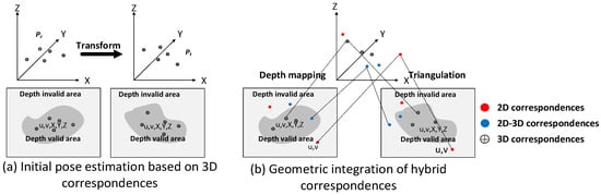 (a) Initial pose estimation based on 3D correspondences; (b) Geometric integration of hybrid correspondences.