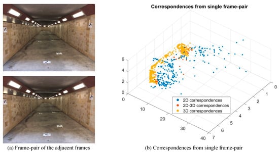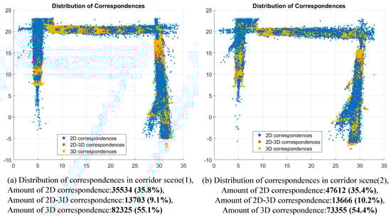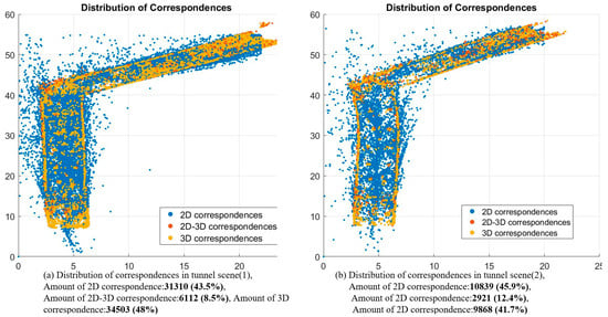 The distribution of different types of correspondences, including 2D correspondences, 2D-3D correspondences, and 3D correspondences, are shown in Figure 13. Distribution of correspondences of corridor scenes. The total percentage of 2D-3D correspondences and 2D correspondence is about 45% in both corridor scenes (1) and (2), which is much smaller than that in the tunnel scenes due to fewer valid depth measurements in each frame.