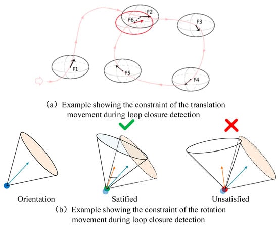 As the image stream is continuous, loop closure is most likely to be found when two frames have a short movement distance. Therefore, for each frame, we utilize a movement metric sensitive to both rotation and translation which indicates when to add a new frame to the place recognition. We first define an ellipsoid region for the current frame in Equation (16), in which the origin is the position of the current frame and correspond to the semi-major axis and semi-minor axis of the ellipse. If this movement metric of translation, is below 1, it means the compared frame located in the ellipsoid. The rotation movement metric is then quantized by Equation (17), it calculates the angle movement of the rotation between the current frame and the target frame. The loop closure candidate is recognized when both goes below a specified angle threshold and goes below 1, as Figure 4 shown. Empirically, we found provides good performance: