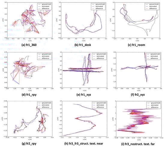 We first evaluated the hybrid SLAM method using the publicly available RGB-D benchmark dataset from TUM datasets [35], which contain ground truth information for camera poses organized in time-series, are used to assess the accuracy of the camera trajectory. The results are compared with some state-of-the-art SLAM methods. Nine sequences are processed and the quantitative results are shown in Table 1 and Figure 5. The median (max) absolute trajectory error (ATE) is calculated by the automated evaluation tool provided by [35]. It calculates the RMSE of the Euclidean distances between the camera trajectory and the timestamp associated ground truth, and it is used to evaluate the procedure’s accuracy.