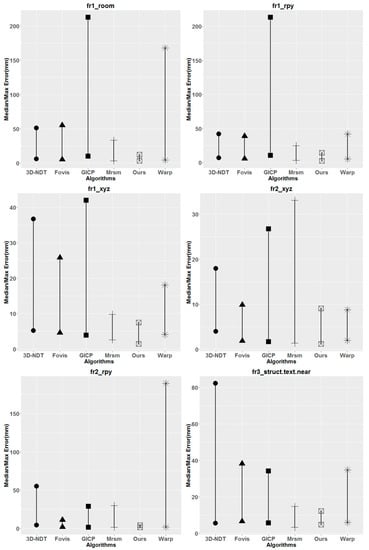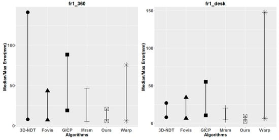 Comparisons of the median/max absolute trajectory error (ATE) in mm for incremental registration on RGB-D sequences from the Freiburg benchmark dataset. In each plot, different vertexes represent different methods. The higher vertexes represent the max ATE and the lower vertexes are the median ATE.