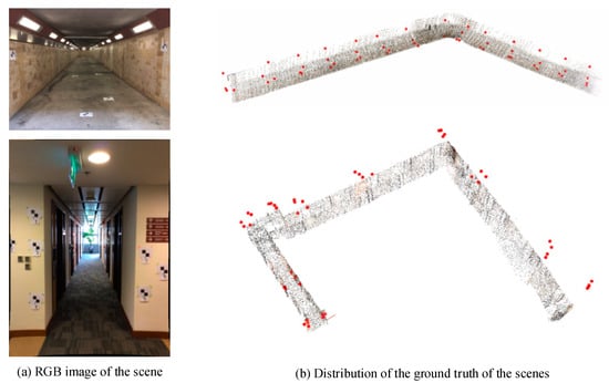 Experiments were carried out to evaluate the effectiveness of the proposed geometric integration method. We evaluated mapping accuracy with four sets of RGB-D sequences recorded in a tunnel and a corridor with a handheld Structure Sensor device. Evaluating the accuracy of the SLAM methods requires ground truth data. As shown in Figure 7, 54 and 46 targets are evenly distributed along the tunnel and corridor, and measured by total station, which serves as ground truth for accuracy evaluation and comparison.