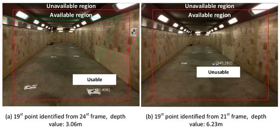 For each checkpoint, we use three conditions to obtain the optimal result: (1) to avoid the impact from depth uncertainty, only the points with a depth value less than 3.5 m are considered; (2) as each checkpoint can be identified from multiple frames, only the point with minimal depth value is considered; and (3) the identified point should be located in the available region on the image, which is bounded by a 30 × 20 pixels patch. As shown in Figure 8, the 19th point can be identified from 24th and 21st frames, the depth values of which are 3.06 m and 6.23 m, respectively. According to our checkpoint determination strategy, only the point obtained from the 24th frame is used as the checkpoint.