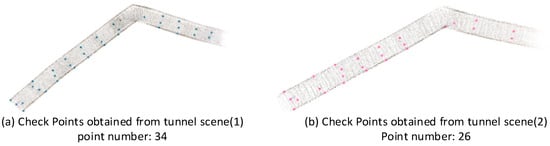 Tunnel scenes, marked with the checkpoints, (a) checkpoints obtained from tunnel scene (1); (b) checkpoints obtained from tunnel scene (2).