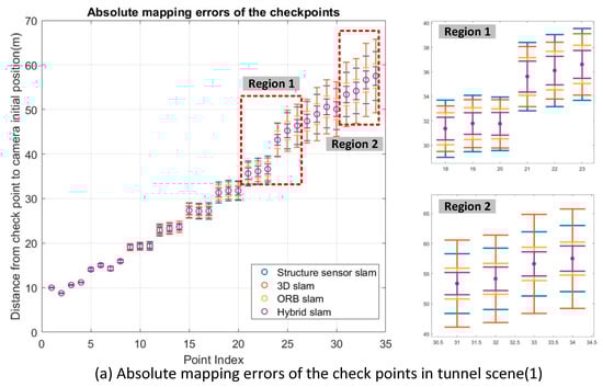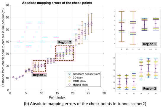 To evaluate the absolute mapping accuracy of the different SLAM methods, a rigid transformation was first applied to these four sets of checkpoints using four control points, such that the initial positions of ground truth and the SLAM system were the same. The mapping accuracies of these four methods, Structure Sensor SLAM, 3D SLAM, ORB SLAM and hybrid SLAM, were compared using the 34 and 26 checkpoints previously mentioned. The discrepancies were calculated by comparing the checkpoint sets derived from the four SLAM methods against the ground truth. If there was no bias in the camera poses after SLAM, the positions of the checkpoints should be the same as the ground truth. However, Figure 11 indicates that this was not the case. In Figure 11, the X axis shows that the point index increased with the camera trajectories and the Y axis denotes the absolute distances of the checkpoints to the initial camera position. The discrepancies for each checkpoint with the different SLAM methods are presented by an error bar with different colors. As expected, the mapping errors grow linearly as the point index increases in both tunnel scenes (1) and (2). We highlight two error bar segments that correspond to the regions marked by red rectangle in Figure 11 to clarify the tracking results of different SLAM systems. This illustrates that the absolute mapping errors from hybrid SLAM are much smaller than those in all other cases. Table 3 lists the detailed statistics of absolute mapping errors and the ratio of the mapping errors to trajectory lengths using different SLAM methods in both tunnel scenes. As the ORB SLAM failed to track in the middle of tunnel scene (2), we calculate the ratio of the error with the corresponding trajectory length, which is 26 m. From Table 3 the following can be noted. The Structure Sensor SLAM method produces a mapping accuracy of 2.96 m in tunnel scene (1) and 3.56 m in tunnel scene (2). The 3D SLAM method produces a mapping accuracy of 3.73 m in tunnel scene (1) and 3.68 m in tunnel scene (2). ORB SLAM achieved a mapping accuracy 1.55 m in tunnel scene (1) and 1.17 m (with trajectory length of 26 m) in tunnel scene (2). The Structure Sensor SLAM and 3D SLAM generated similar results, as they used the same feature detector and only use 3D correspondences for camera tracking. The hybrid SLAM method outperforms all of other approaches in both tunnel scenes (1) and (2).