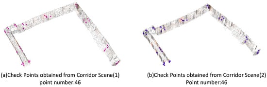 Forty-six checkpoints were identified manually to confirm the results of the geometric integration in corridor scenes. The distributions of the checkpoints are marked in corridor scenes (1) and (2), as shown in Figure 12. Corridor scenes, marked with the checkpoints, (a) checkpoints obtained from corridor scene (1); (b) checkpoints obtained from corridor scene (2).