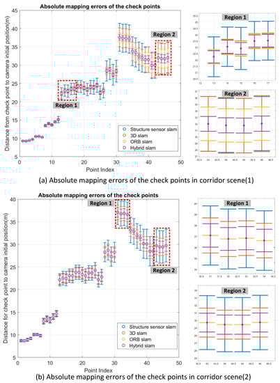 The checkpoints set and the ground truth of the corridor scenes were initially aligned by control points identified from the first RGB-D frame. The performances of the geometric integration approaches were evaluated by comparing the ground coordinates derived from the three methods with the ground truth data. The discrepancies of each checkpoint from different SLAM methods are presented by error bars with different colors, as shown in Figure 14. Absolute mapping errors of the checkpoints along with camera trajectories. Similarly, the drift errors are accumulated as the point index increases in both corridor scenes (1) and (2). From the error bar segments corresponding to the part of error bars marked in red rectangle regions in Figure 14. Absolute mapping errors of the checkpoints along with camera trajectories, the hybrid SLAM method achieved a much higher mapping accuracy than the others.