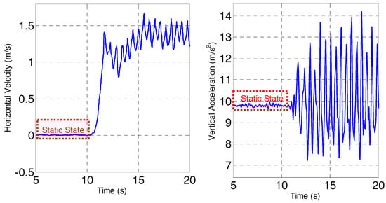 Horizontal velocity (left) and vertical acceleration (right) during static state and walking.