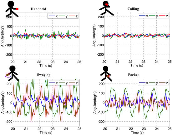 Several indoor walking experiments were conducted using two phones (a Samsung S6 and a Xiaomi 4) to collect data. The two smartphones were held by different pedestrians following the same pre-planned path (approximately 80-m) three times, as shown by the red line in Figure 3. The Samsung S6 data is used as a sample to illustrate the experimental results. The tested pedestrian phone-holding positions included handheld (e.g., texting), calling (e.g., holding the phone close to an ear), swaying (e.g., walking while swinging the phone in the hand), and pocketing (e.g., keeping the phone in a front pants pocket). Figure 4 illustrates the tested phone motion modes and the corresponding gyro readings. In order to provide the reference values, we recorded the timestamps when passing a corner and wrote them into a file during the test. We also obtained the coordinates of the aforementioned corners by selecting the corresponding point on a high-precision map. Next, the coordinates of the line segments between the two corners were calculated by linear interpolation in time.